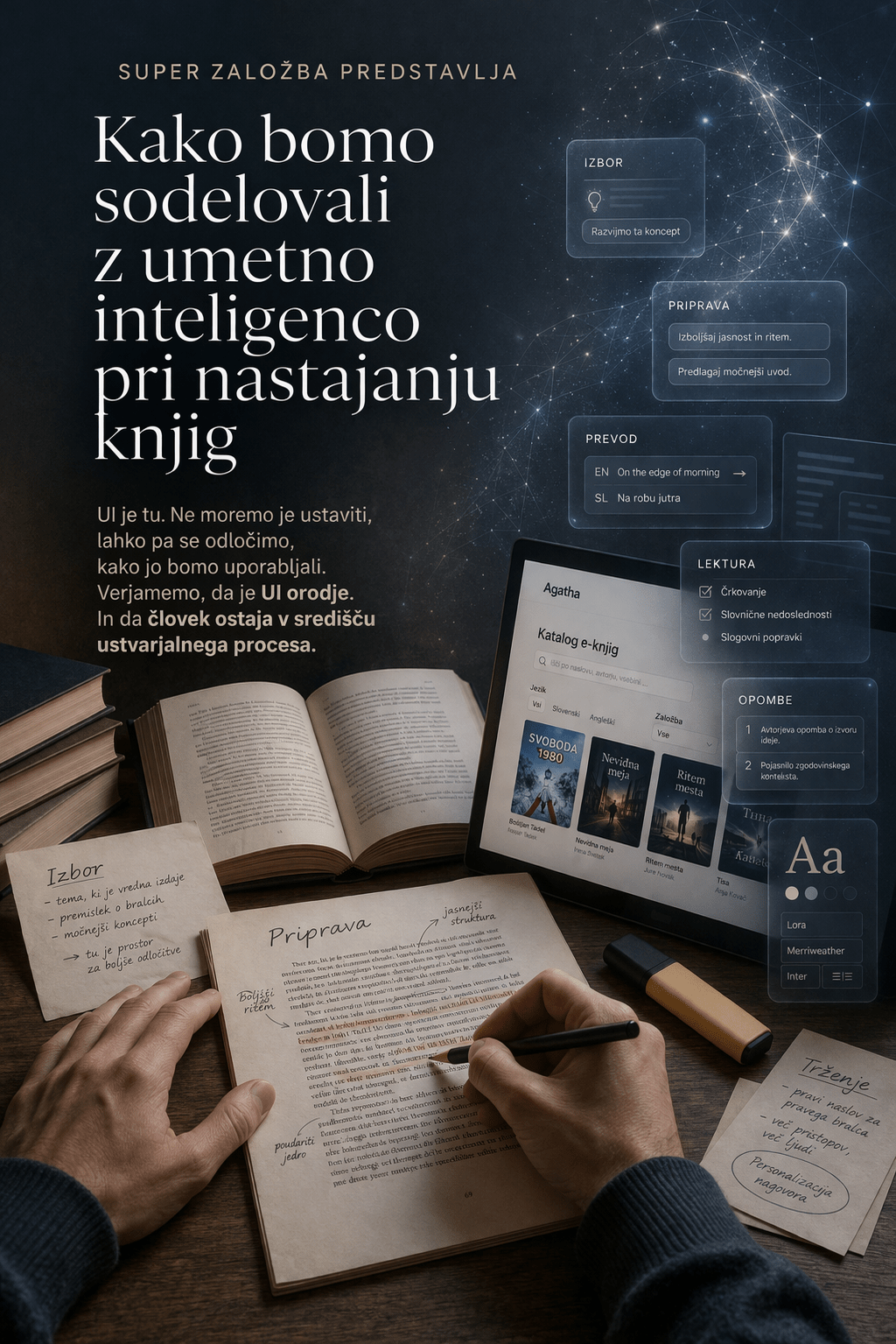 Priprava knjige je zelo zahteven in dolgotrajen proces, v katerega je vpletenih veliko strokovnjakov in ur človeškega intelektualnega dela. Tega ni mogoče v celoti nadomestiti z roboti, niti si tega ne bi želeli. Kdor danes panično deli svet na tehnooptimiste, ki bodo vse pokvarili s poplavo »UI-pomij«, in na tehnopesimiste, ki morajo zaščititi tradicionalni proces, kot ga poznamo že dvesto let, je bodisi nevarno naiven bodisi zgolj blefira in nabira poceni točke.
